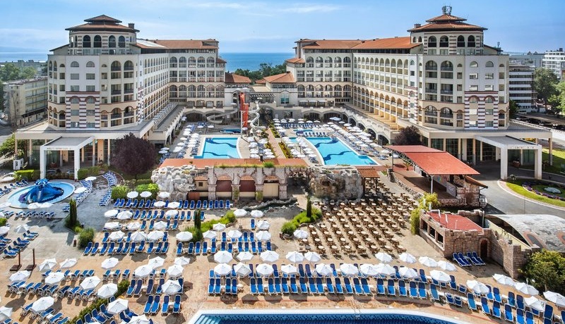 Der weitläufige Hotelkomplex unter neuer Leitung der renommierten Sol Melia-Kette besteht aus 3 Gebäudeteilen mit insgesamt 1025 Zimmern auf 8 bzw. 9 Etagen und vielen zusätzlichen Einrichtungen und Annehmlichkeiten. Jeder Block hat eine eigene Lobby mit Rezeptionsbereich, Geldwechsel-Service (im Block A und B), Lobbybar, Lifte und verfügt über ein eigenes Buffetrestaurant (saison- und Belegungsabhängig). Hier genießen Sie Frühstück, Mittagessen und Abendessen. In der Hochsaison häufig auch Themenbuffets wie z. B. bulgarisch, spanisch, italienisch oder international.