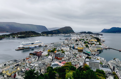 Die Stadt Ålesund ist wie dafür gemacht, ihre Besucher auf dem Seeweg zu empfangen – zeigt doch ihr Wappen ein Schiff mit geblähtem Segel. Ålesund liegt auf den Inseln Aspøy, Heissa und Nørvøy, die durch Brücken und Tunnel miteinander verbunden sind. Eine Kreuzfahrt durch das weit verzweigte Fjordsystem in Norwegens Westen ist eine unvergessliche Reise, die gekrönt wird von einem Besuch in der vom Jugendstil geprägten Stadt.