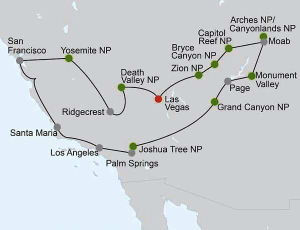Erkunden Sie die Naturschauplätze im Südwesten der USA mit ihren roten Felsen bei Tag und unvergleichlichem Sternenhimmel bei Nacht. Als Kontrast dazu erleben Sie die Metropolen des amerikanischen Westens. Freuen Sie sich auf die Kasinostadt Las Vegas, die Hollywoodmetropole Los Angeles sowie San Francisco, die Stadt an der Bucht, die mit ihrer Golden Gate Bridge weltbekannt ist. Highlights: Las Vegas, Zion NP, Bryce Canyon NP, Capitol Reef NP, Arches NP, Monument Valley, Grand Canyon NP, Palm Springs, Los Angeles, San Francisco, Yosemite NP, Death Valley