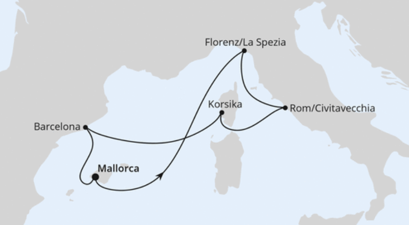 Wo das Meer in Türkis schimmert und die Sonne mediterrane Träume weckt, beginnt Ihre unvergessliche Reise. Entdecken Sie die wilde Schönheit Korsikas die Kunst und Eleganz von Florenz, das lebendige Barcelona und das zeitlose Rom. Genießen Sie entspannte Tage an Bord, kulinarische Highlights und faszinierende Kultur – eine Kreuzfahrt, die Erinnerungen fürs Leben schafft.
