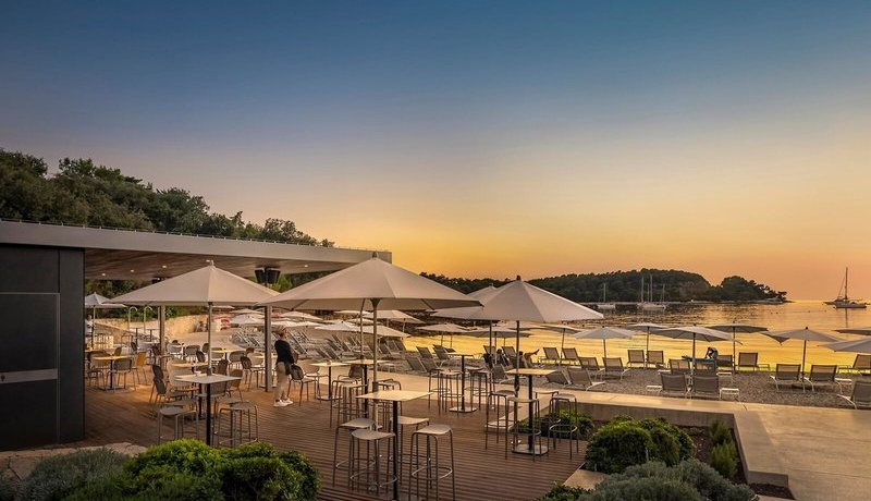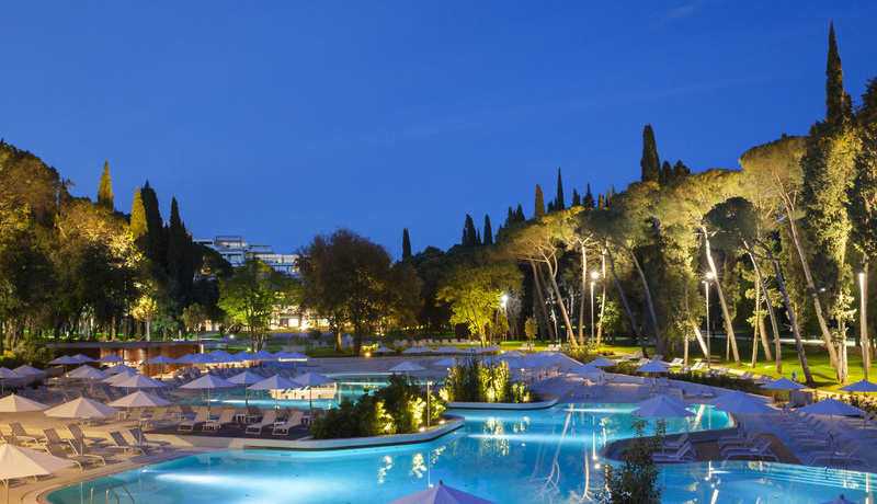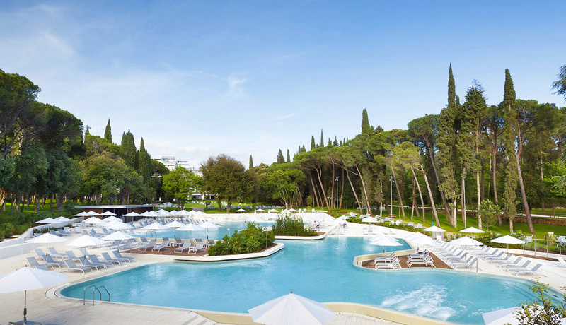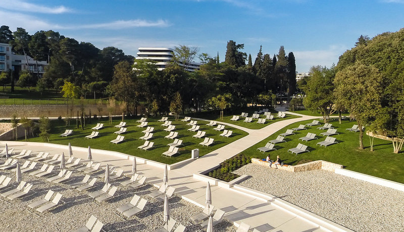 Lage & Umgebung Traumhaft an einer geschwungenen Bucht und inmitten des schattenspendenden hundertjährigen Waldparks Zlatni gelegen. Der flach abfallende Kies-/Felsstrand mit Badeplateaus liegt ca. 250 m vom Hotel entfernt, Rovinjs Ortsmitte ca. 1 km.