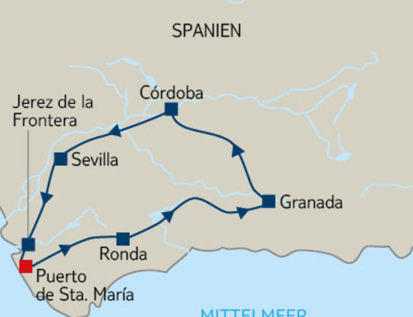 Nach Wunsch und persönlichem Tempo entdeckst du die Kulturschätze Andalusiens auf eigene Faust: Flamenco, Tapas, Sherry und andalusische Pferde vereinen sich mit majestätischen Palästen und malerischen Landschaften zu einer Woche voller Erinnerungen.