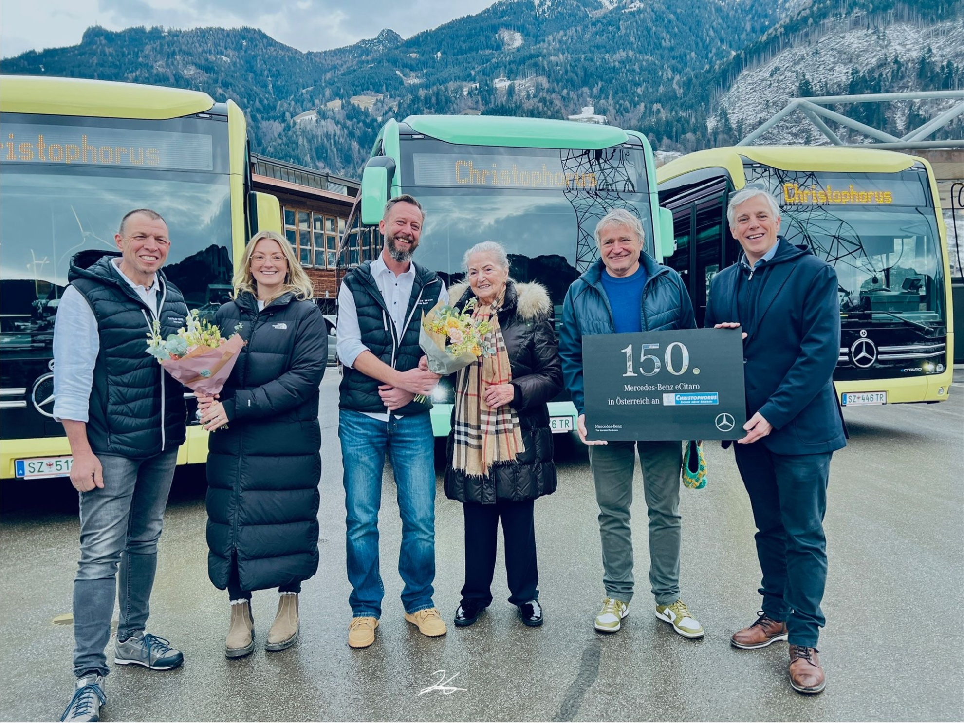 Dieser Anlass steht nicht nur für eine Zahl, sondern für eine klare Haltung: Bereits in den Jahren 2023 und 2024 haben wir die ersten Elektrobusse erfolgreich in Betrieb genommen. Mit der Erweiterung unserer Flotte um weitere zehn eCitaro setzen wir diesen Weg konsequent fort. Eines dieser Fahrzeuge markiert nun einen österreichweiten Meilenstein. Für uns bedeutet diese Entwicklung weit mehr als die Anschaffung moderner Fahrzeuge. Sie ist ein Bekenntnis zu nachhaltiger Mobilität, Verantwortung und Zukunftssicherheit, gerade in einer touristisch geprägten Region wie dem Zillertal. Heute betreiben wir sämtliche Regelfahrzeuge der Kraftfahrlinien sowie des Tuxer Sportbusses zu 100 % elektrisch und ausschließlich mit Ökostrom. Damit leisten wir einen aktiven Beitrag zur Dekarbonisierung des öffentlichen Verkehrs und erfüllen nicht nur die Vorgaben der EU-weiten Clean Vehicles Directive – wir gehen bewusst einen Schritt weiter. Ein besonders bewegender Moment war die Anwesenheit unserer Seniorchefin Maria Kröll bei der feierlichen Übergabe. Dies unterstreicht noch mehr, wie tief Werte, Tradition und Verantwortung in unserem Unternehmen verankert sind. Unser Dank gilt auch unserem starken Partner Daimler Buses Österreich, mit dem wir gemeinsam an der Mobilität von morgen arbeiten. Christophorus Reisen steht für Innovation mit Verantwortung – heute und in Zukunft.
